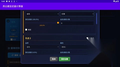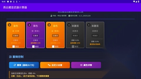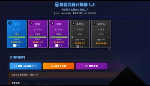 燕云藏音武器计算器是专门为燕云十六声游戏设计的武器计算工具。这款计算器由玩家自制而成,能够协助大家计算武器重铸开孔、洗练词条、孔位锁定、保底次数等内容。只需选择对应的计算功能,输入相关数据就能快速得出结果,无需自己手动盲目计算材料、依赖运气洗武器,也不用再被游戏的保底机制坑到,不仅操作简单便捷,计算结果还十分精准!
