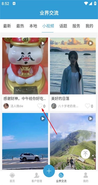 1、启动软件后,进入视频界面,界面上呈现多个视频内容,箭头指向点赞按钮,即将对视频进行互动操作。