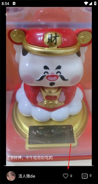 2、点击第一个视频进入详情页面,页面会呈现财神摆件的相关内容,箭头指向点赞按钮,用户可通过该按钮完成点赞的互动操作。