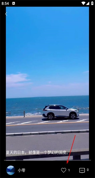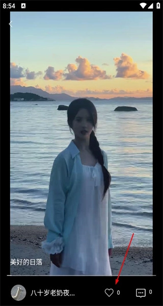 3、点击第二个视频进入详情页面,页面展示日落相关内容,箭头指向点赞按钮,即将执行点赞操作。