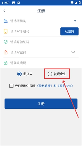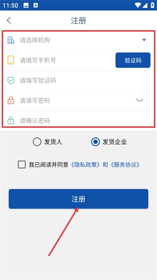 3、进入【注册】界面后,先将身份类型选定为【发货企业】,接着按顺序填写机构、手机号等相关注册信息。