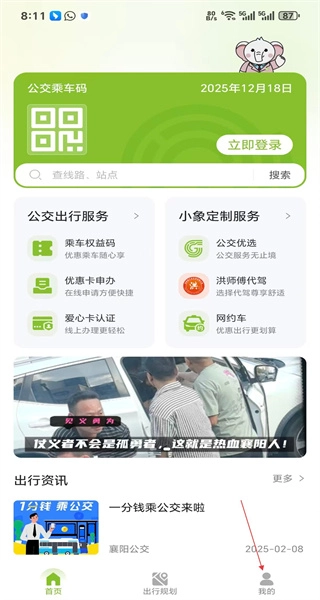 进入襄阳出行首页后,能看到公交乘车码以及各类出行服务的入口,点击底部相应按钮,即可进入个人页面。