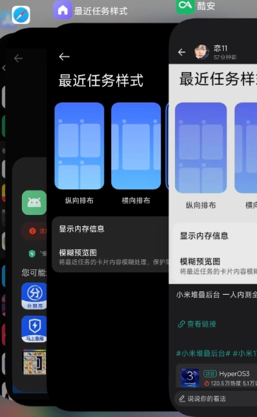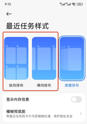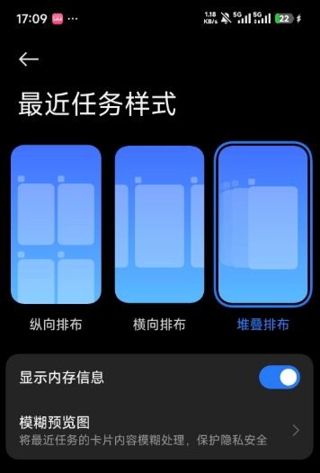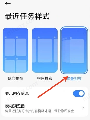 3、可随时进入「最近任务样式」设置界面,自由切换堆叠式与传统式后台显示模式,更改后即时生效,无需重启设备。