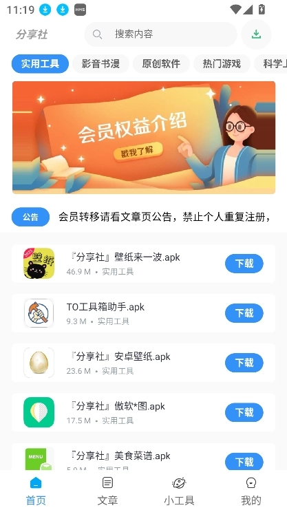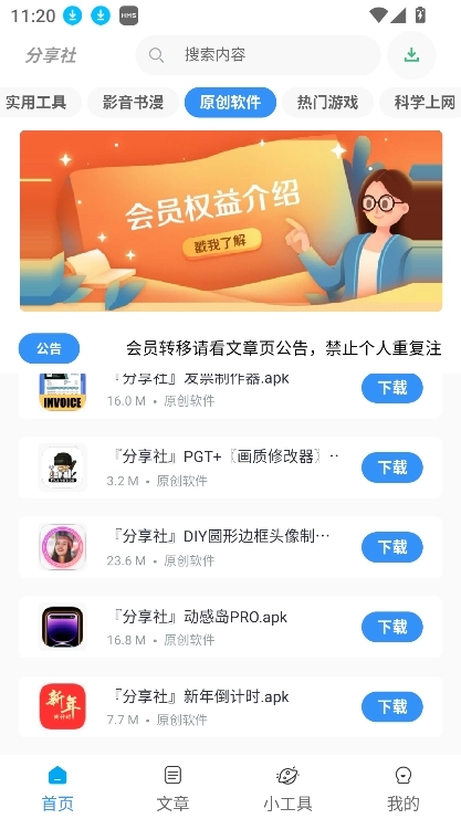 在分享社软件库里,你能轻松获取各类所需的手机应用资源,实用工具、影音书漫、原创软件、热门游戏、科学上网等不同类型的资源应有尽有,这里分类细致,还配备了搜索功能,能帮用户快速定位到自己需要的资源。