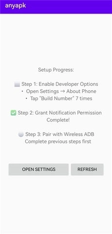 4、之后回到anyapk软件里,能看到第一步前面已经打上了绿色的√。接下来要进行第三步——无线ADB配对,再次点击左下角的【OPEN SETTINGS】就可以了。