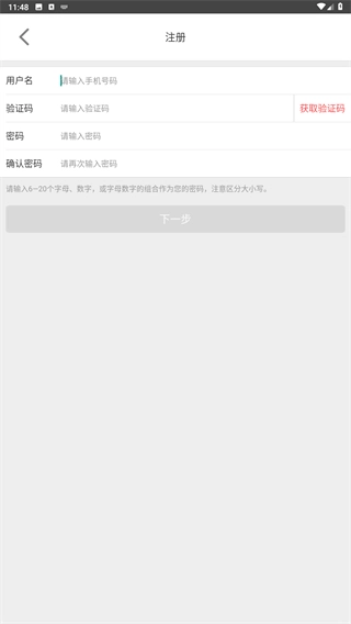 4、进入注册页面后,先在【请输入手机号码】栏填写号码,接着点击【获取验证码】按钮并填写收到的验证码,随后设置密码,最后点击【下一步】按钮即可完成注册流程。
