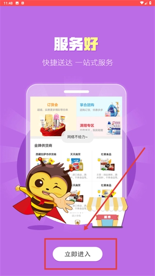 1、在平台宣传页面点击【立即进入】按钮,进入应用主界面后,即可使用订货会、团购等功能。