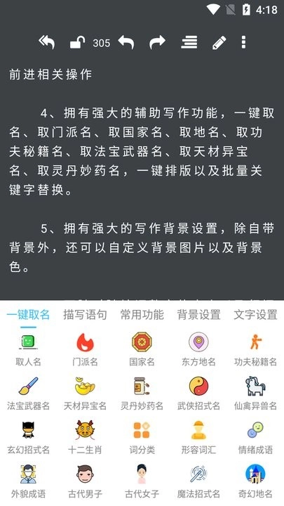 4.丰富实用的辅助写作功能:该软件配备了一键生成各类名称的便捷工具,涵盖人名、门派名、国家名、地名、功夫秘籍名、法宝武器名、天材异宝名、灵丹妙药名等,同时还支持一键排版与批量关键词替换功能,全方位助力写作过程。