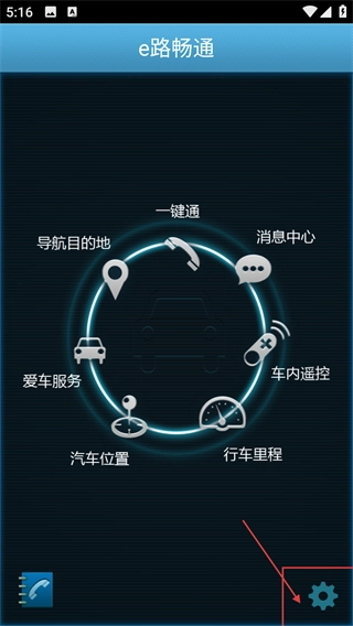 1、打开“e路畅通”主界面,这里整合了一键通、导航目的地设置等车载功能模块,点击界面右下角的【设置】按钮,即可进入账号管理相关的操作页面。