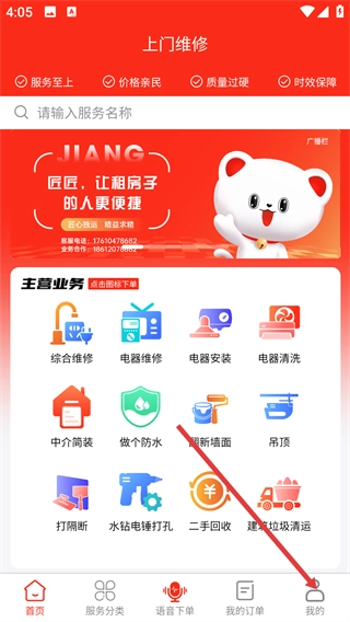 进入上门维修首页后,能选择“综合维修”“电器维修”等主要业务选项,提交对应服务的下单申请。