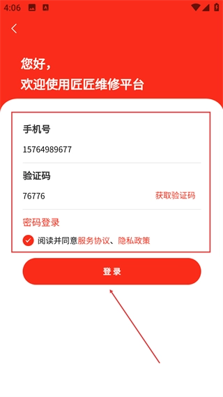 4、进入登录页面后,依次填写手机号、验证码,勾选相关协议,随后点击【登录】按钮,就能完成账号登录,进而使用更多功能。