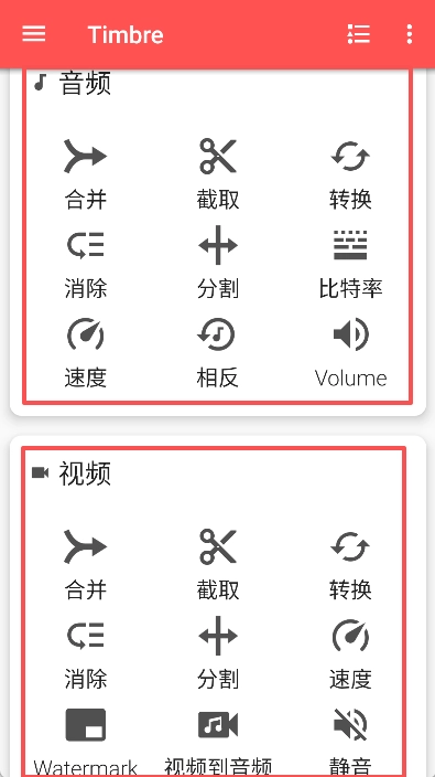 Timbre是一款集合了超多音视频功能的手机应用,能让我们轻松完成剪辑与处理操作。而且安卓中文版的Timbre还把这些功能做了细致分类,这样要用什么功能直接点对应的按钮就行,省去了不少麻烦!不管是剪辑视频还是音频,它支持的格式都特别多,像视频格式就涵盖MP4、AVI、FLV等主流类型,音频也支持MP3、WAV等,功能超级全面!