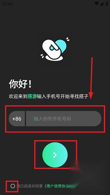 2、进入登录页面后,填写手机号,勾选“我已阅读并同意《用户使用协议》与《隐私条款》”,然后点击右侧的箭头按钮。