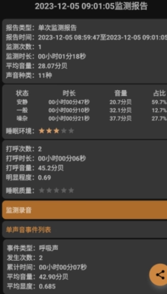 3.详细报告:依托监测所获取的数据,生成涵盖打呼噜频次、持续时长、声响强度等多项指标的睡眠质量报告,助力用户全方位知晓自身的睡眠状况。
