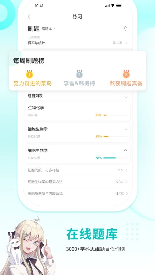 4、免费题库:平台收录海量经典题目,学生能够无限制地进行刷题练习。此外,学生还可以随时查看自己的刷题数量和答题正确率,从而更清晰地评估自身的学习情况。