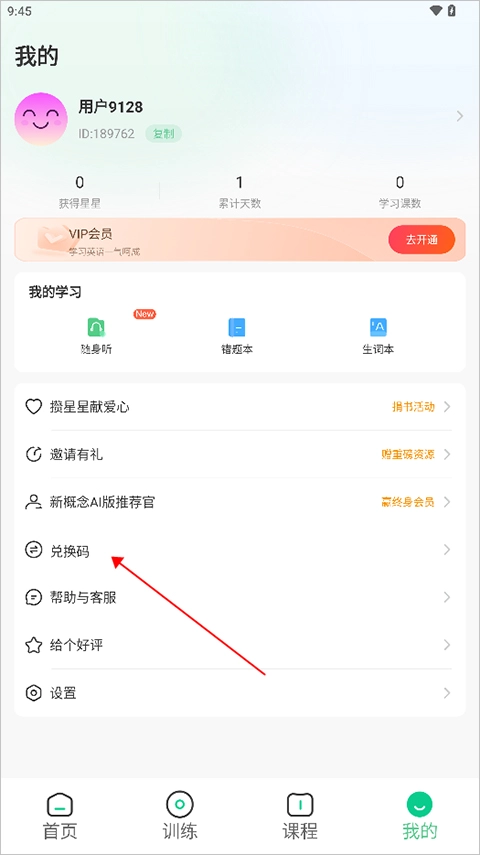 1、打开并登录新概念AI版后,进入【我的】页面,接着点击【兑换码】选项