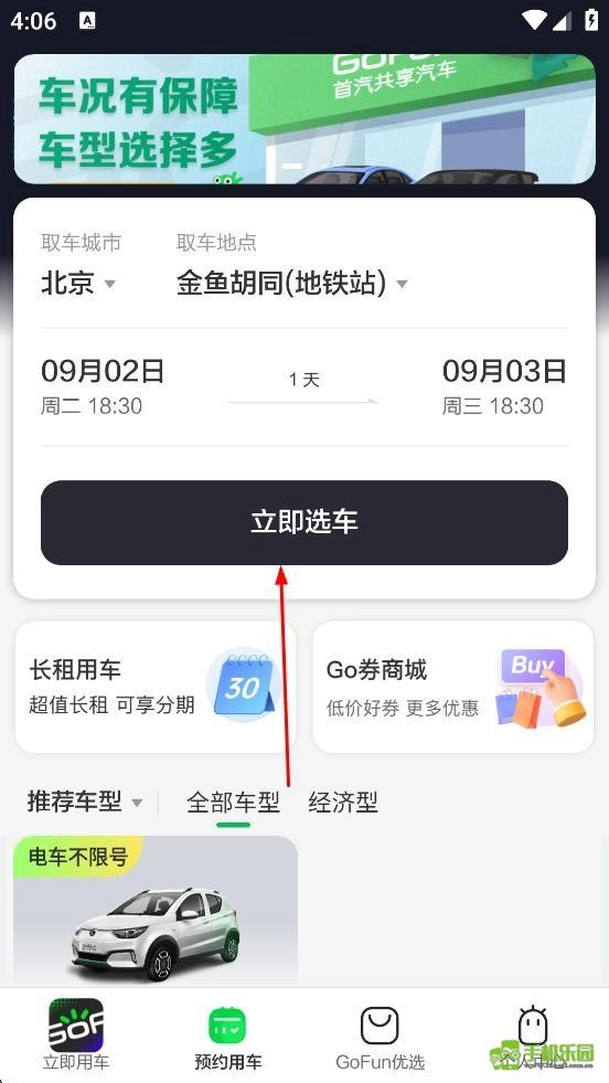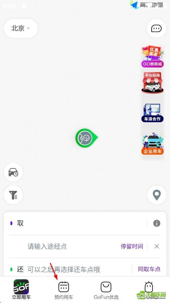 1、启动GoFun出行应用程序,在首页底部的功能栏里找到“预约用车”这一选项并点击进入,随后在预约用车页面完成取车城市、取车地点和用车时间等相关信息的设置。