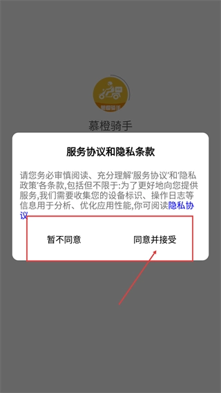 1、当出现【服务协议和隐私条款】的弹窗时,请仔细阅读相关条款内容,之后点击【同意并接受】按钮,即可继续进行应用后续的操作步骤。