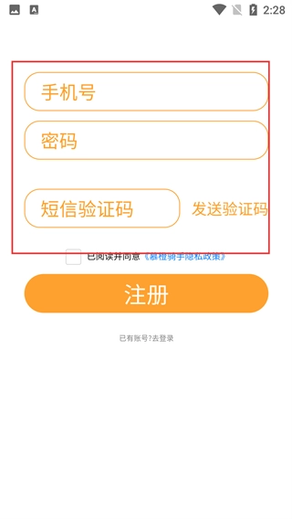 3、在注册页面,需要按顺序填写【手机号】和【密码】,点击【发送验证码】按钮获取并填写【短信验证码】,勾选相关协议后即可完成注册流程。