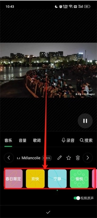 2、进入视频编辑界面后,点击下方的音乐功能选项,开启声音编辑操作。