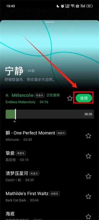 4、选好契合视频主题的类型后,打开软件的音乐列表,从中挑选心仪的音乐,点击“使用”按钮就能将其添加到视频里了。