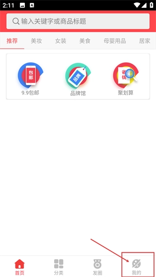 在购物首页,你既可以通过顶部的搜索栏搜索商品,也能点击底部的【我的】按钮,同时还能使用【9.9包邮】【品牌馆】等功能入口。