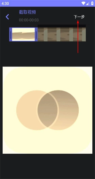 2、进入视频截取界面,调整要截取的视频片段范围,界面会显示截取时长,调整好后点击下一步。
