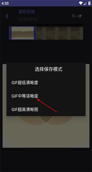 3、弹出保存模式选择选项,其中包含GIF超低清晰度、GIF中等清晰度、GIF超高清晰度,选择相应清晰度选项即可确定保存参数。
