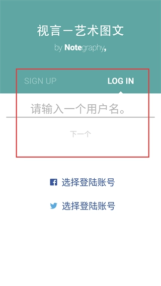 3、切换到登录页面(LOG IN),需要先输入用户名,再点击“下一个”按钮;此外,也能借助Facebook、Twitter账号进行快捷登录。