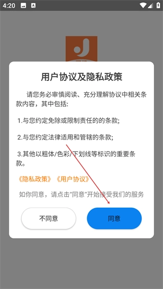 1、仔细阅读【用户协议及隐私政策】里关于责任限制、管辖等方面的条款,之后点击【同意】按钮,这样就能继续使用相关服务了。
