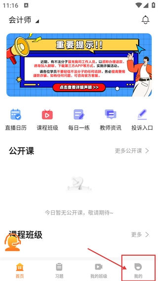 进入首页后,可使用【直播日历】【课程班级】等功能;点击底部的【我的】即可进入个人页面,另外请留意顶部关于防诈骗的重要提示。