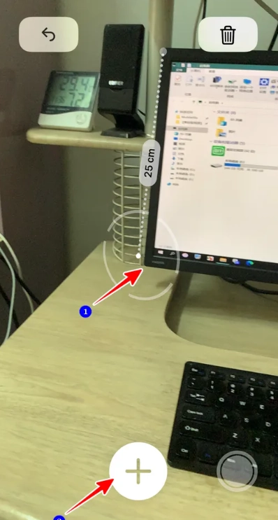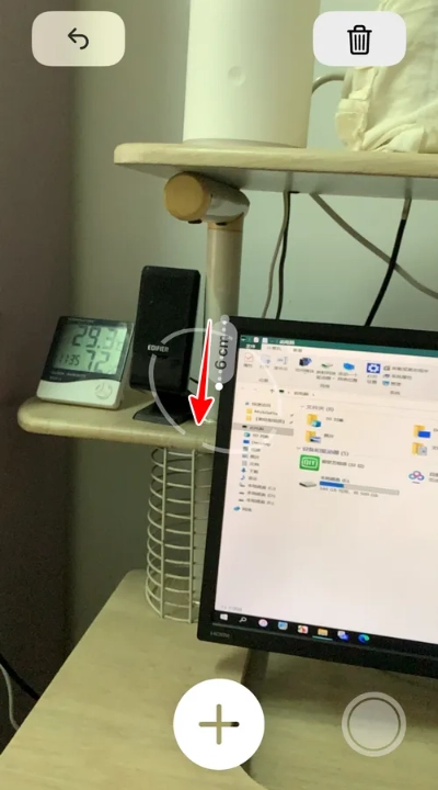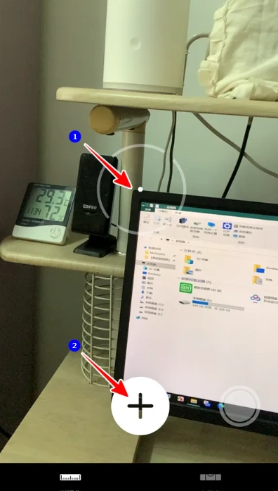 3、校准完成后,屏幕上会显示一个中心有小点的圆圈。把圆圈里的小点移动到需要测量长度的物体的起始位置,然后点击 + 号。