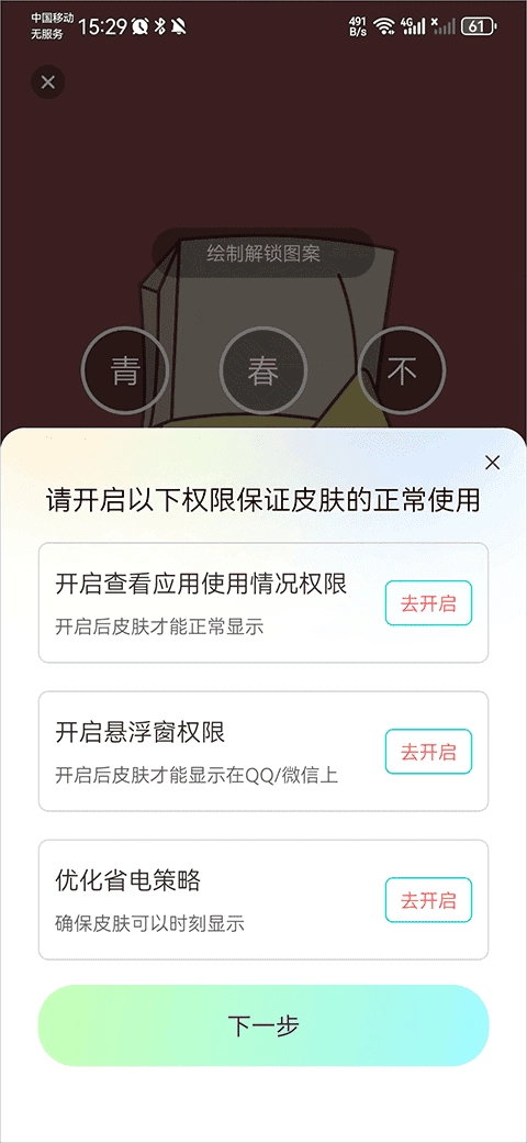 5、接着按照要求开启手机权限,开启完成后返回,再次点击“立即设置”按钮即可。