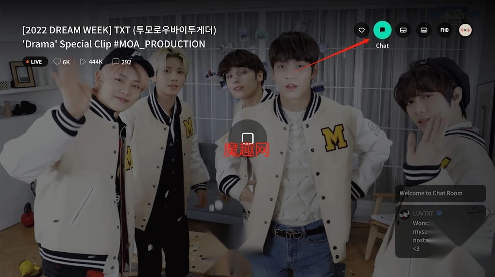 3、在播放界面选择右上角chat可以和偶像互动