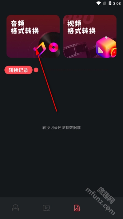 1、点击下方第三个音乐图标,点击音频格式转换
