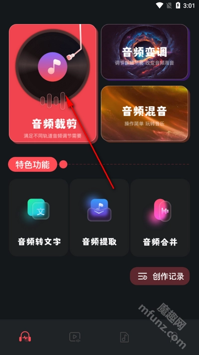 1、打开软件进入首页,点击音频剪辑