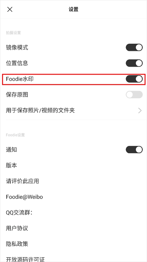 3、向下滑动找到foodie水印功能,该功能默认处于开启状态。
