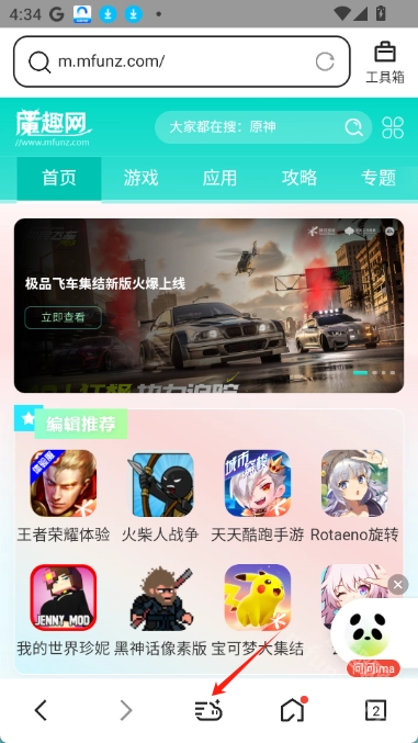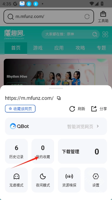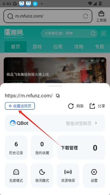 1. 当你浏览到想要收藏的网页时,点击页面底部中间那个形似云朵的图标