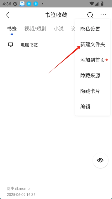 3.然后在书签收藏页面,点击右上角【...】