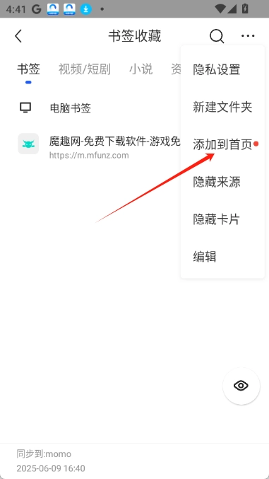 2. 接着在书签收藏界面里点击【....】,选择添加至首页就可以了。