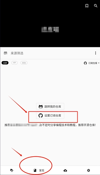 第一次使用时需要导入漫画源:首先进入【发现页面】,然后选择【设置订阅仓库】。