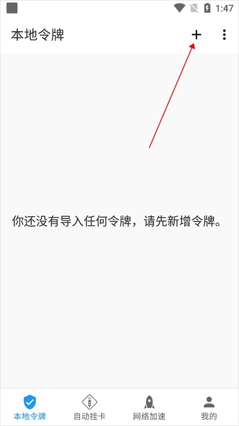 1、刚打开应用会进入令牌页面,用户在这个页面里能够点击右上角的添加按钮。