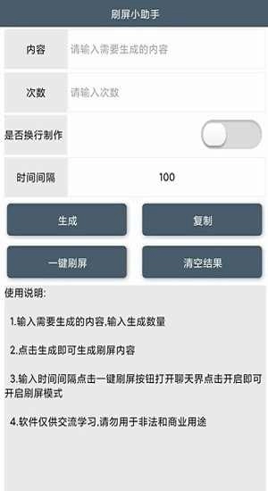 刷屏小助手安卓版是一款专门为安卓用户打造的消息自动化工具。这款应用体积轻盈,占用设备空间非常小,能助力用户完成消息的批量发送与定时发送操作。用户可以自行设置待发送的信息内容、发送的次数以及时间间隔。