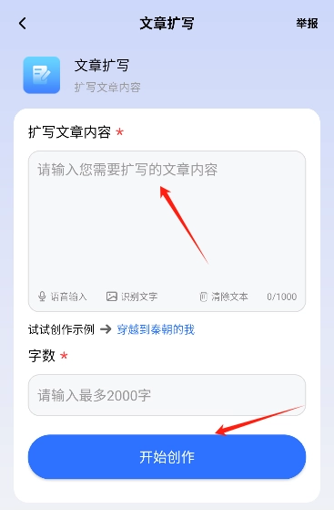 3、比如选择文章扩写,输入内容后点击开始创作。
