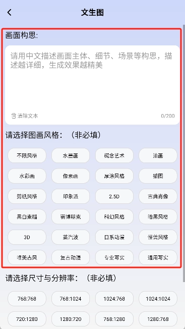 5、点击AI文生图功能,输入对画面的构思描述,选择喜欢的风格后启动创作流程。