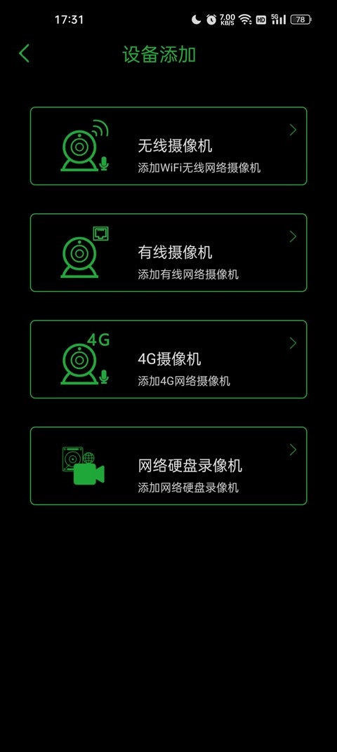 3、接下来挑选你要添加的设备,依据摄像头的类型来操作添加,这里提供无线摄像机、有线摄像机、4G摄像机、网络硬盘录像机这四类设备可供选择。