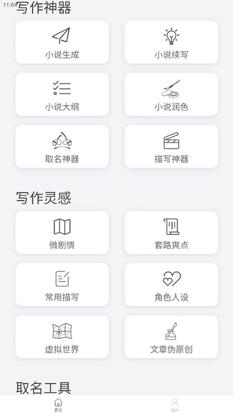 小说生成器主要包含三个核心板块:写作神器、写作灵感与取名工具。