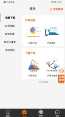 通过丰富的分类体系助力发展提升,用户能够在该软件中浏览到各类服务内容,涵盖企业估值、相关数据申报与内容上传,以及多样化的文档定制服务。