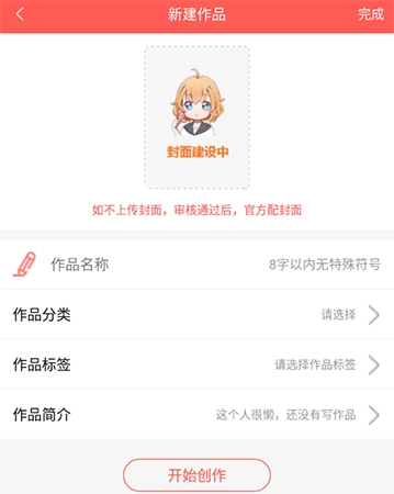 3、接着进入作品编辑页面,上传封面、输入作品名称、选择分类与标签,待作品简介填写完毕后,点击“开始创作”即可。