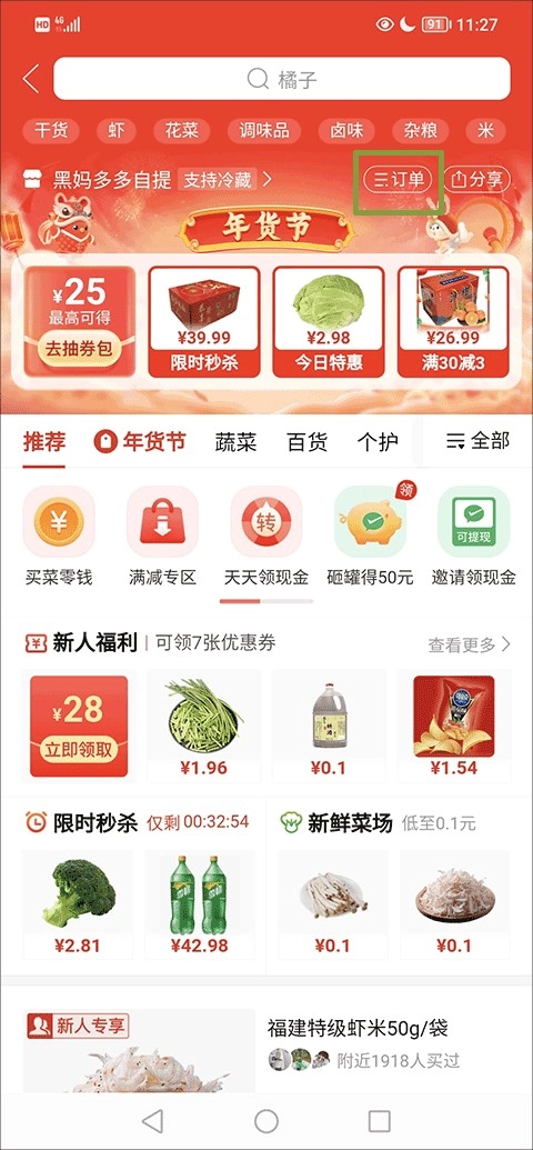 1、首先,打开软件后,在多多买菜的界面里找到“订单”选项并点击它。
